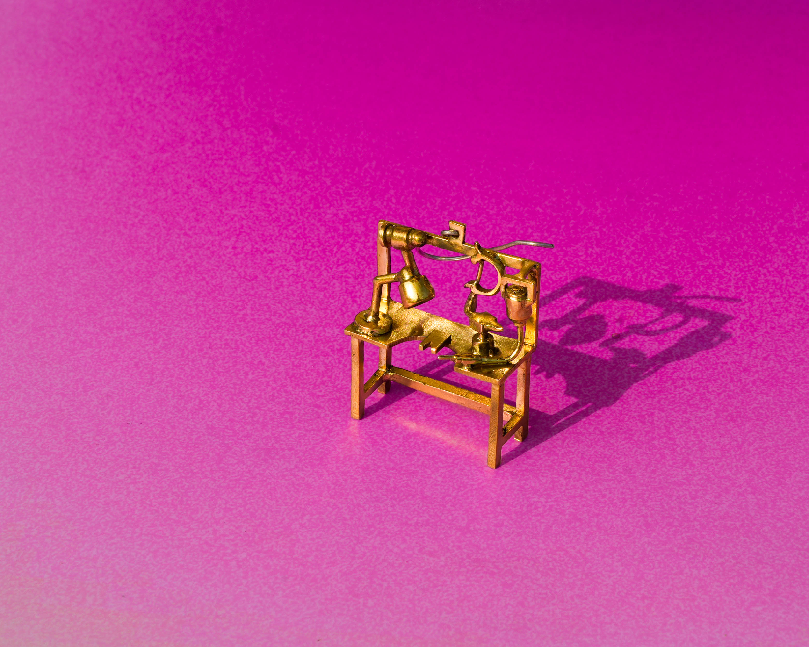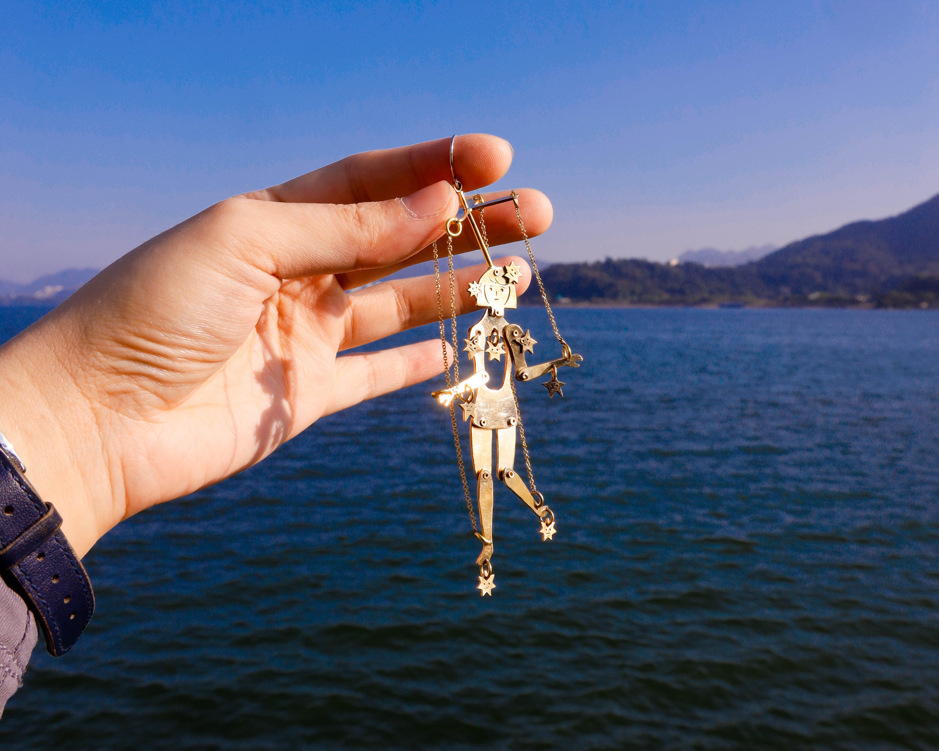 Each piece is hand-built in brass using traditional metalsmithing techniques, transforming miniature objects into wearable moving sculptures.