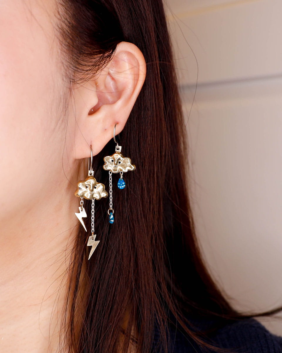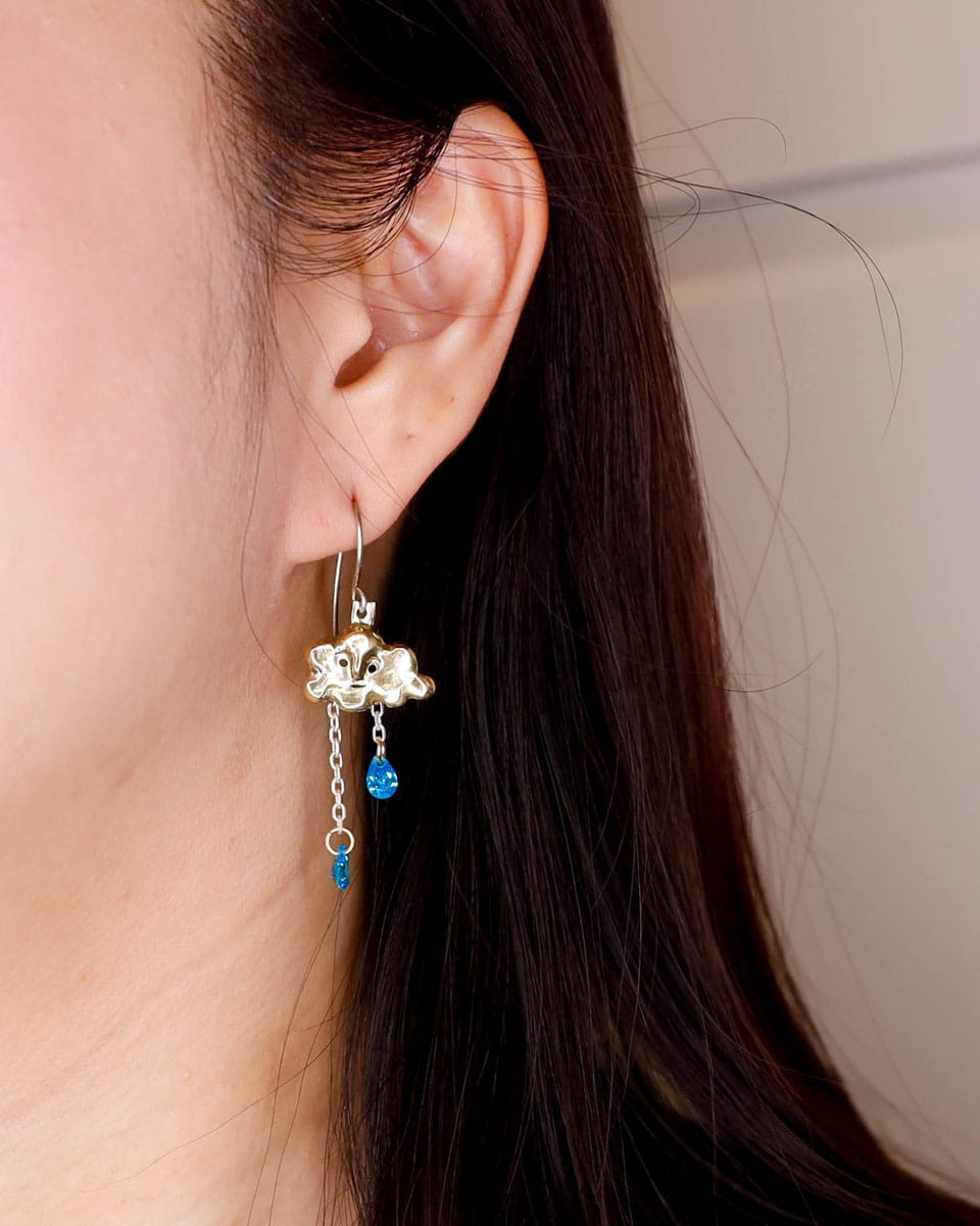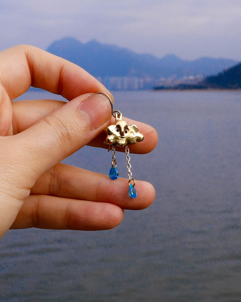 Rainy Cloud earring (or pendant) with each cloud hand-carved in wax, then cast into metal. You can reposition the raindrops by moving the chain. Click here to see