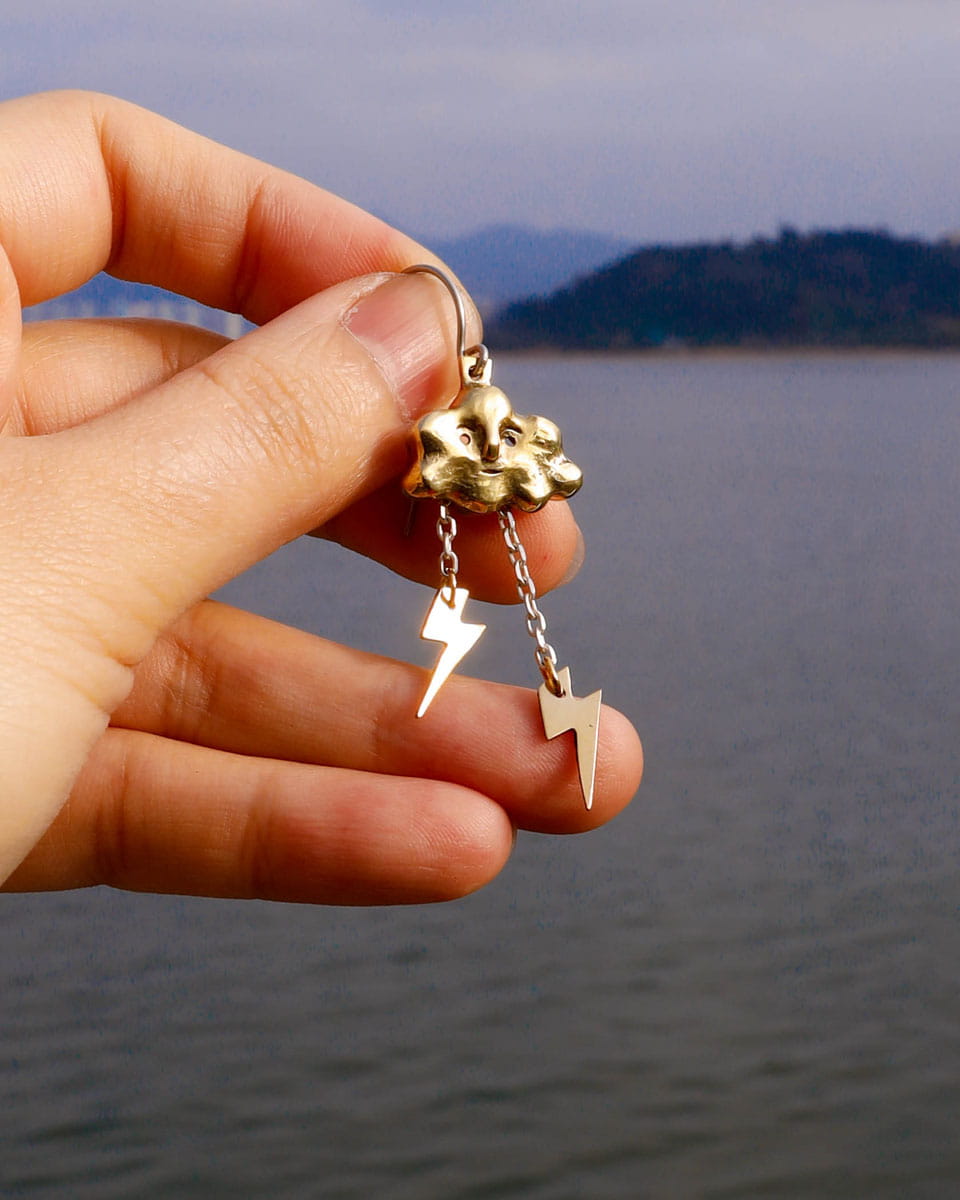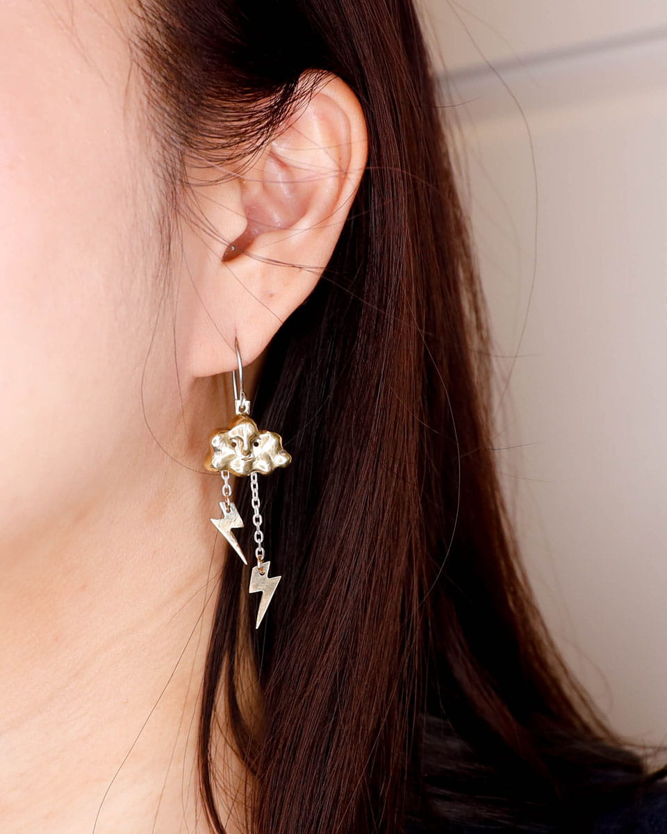 Thunder Cloud earring (or pendant) with each cloud hand-carved in wax, then cast into metal. While each thunder is hand-sawed from metal sheets. You can reposition the thunder by moving the chain. Click here to see
